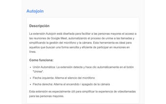 AutoJoin is a free Chrome extension designed to simplify the process of joining Google Meet meetings, particularly for elderly users. It automates the clicking of the 'Join' button, allowing for a seamless entry into virtual gatherings. Additionally, it facilitates easy management of microphone and camera settings through keyboard shortcuts or remote controls, making online participation more accessible for those who may struggle with technology.